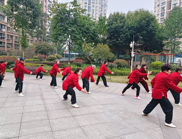 活动现场,参加健身活动的居民朋友热情高涨,有的操练太极拳、有的挥抛揉力球、有的伸展四肢、扭动腰身,现场气氛热烈而欢快,充分展现了全民健身的活力与魅力。